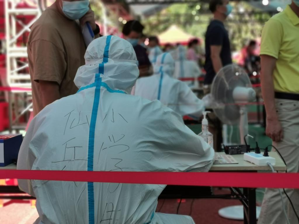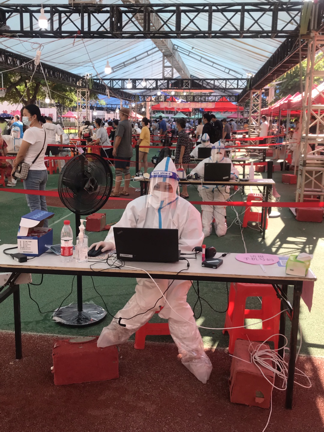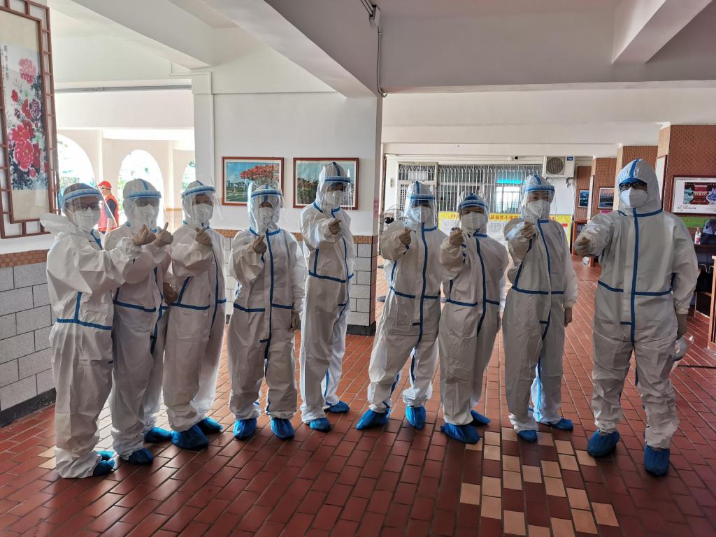 从清晨微光、烈日当空到夜幕降临,老师们穿着密不透风的工作服,忙碌在核酸检测的现场,不厌其烦地录入、拿拭子、核证件、维序.....录入信息时,透过满是雾气、模糊不清的面罩,核对再核对,保证信息准确无误。高温炙烤下,防护服是湿了又干,干了又湿,为了保证全员核酸工作的顺利进行,老师志愿者们仍然坚守阵地,高效、高质量地完成了任务。