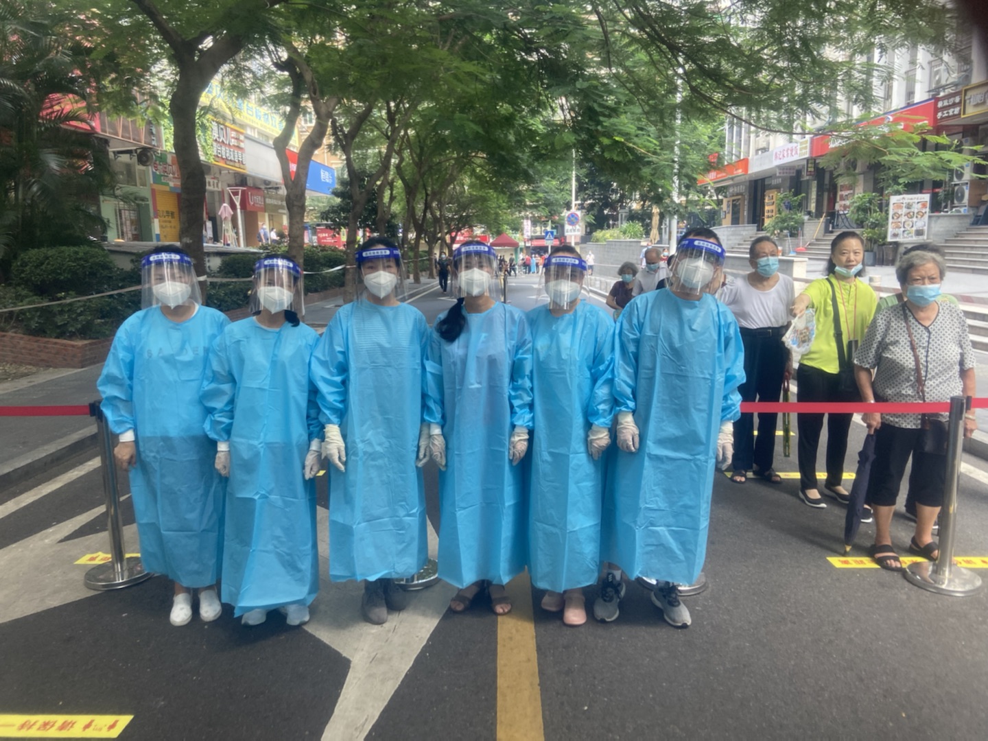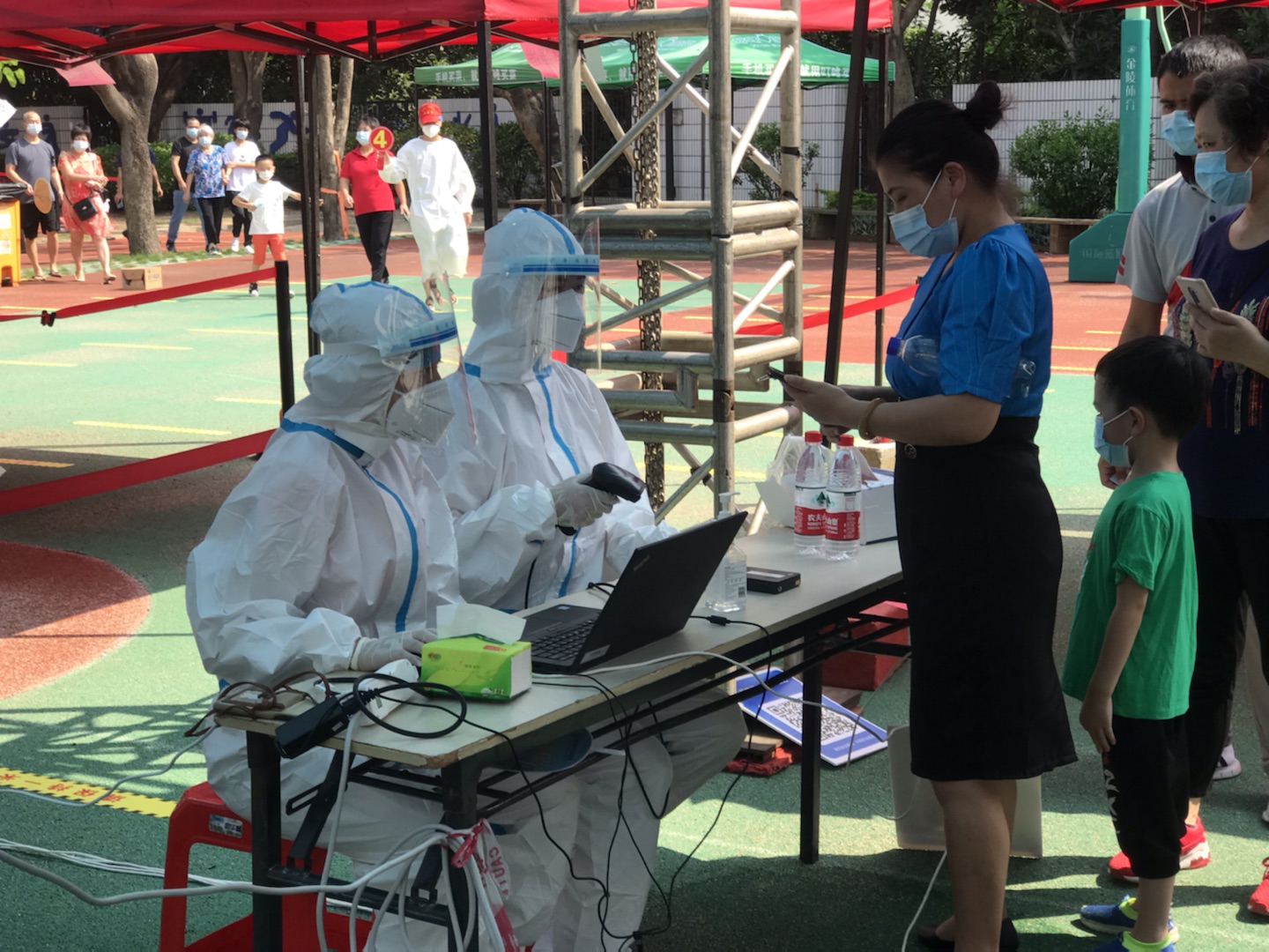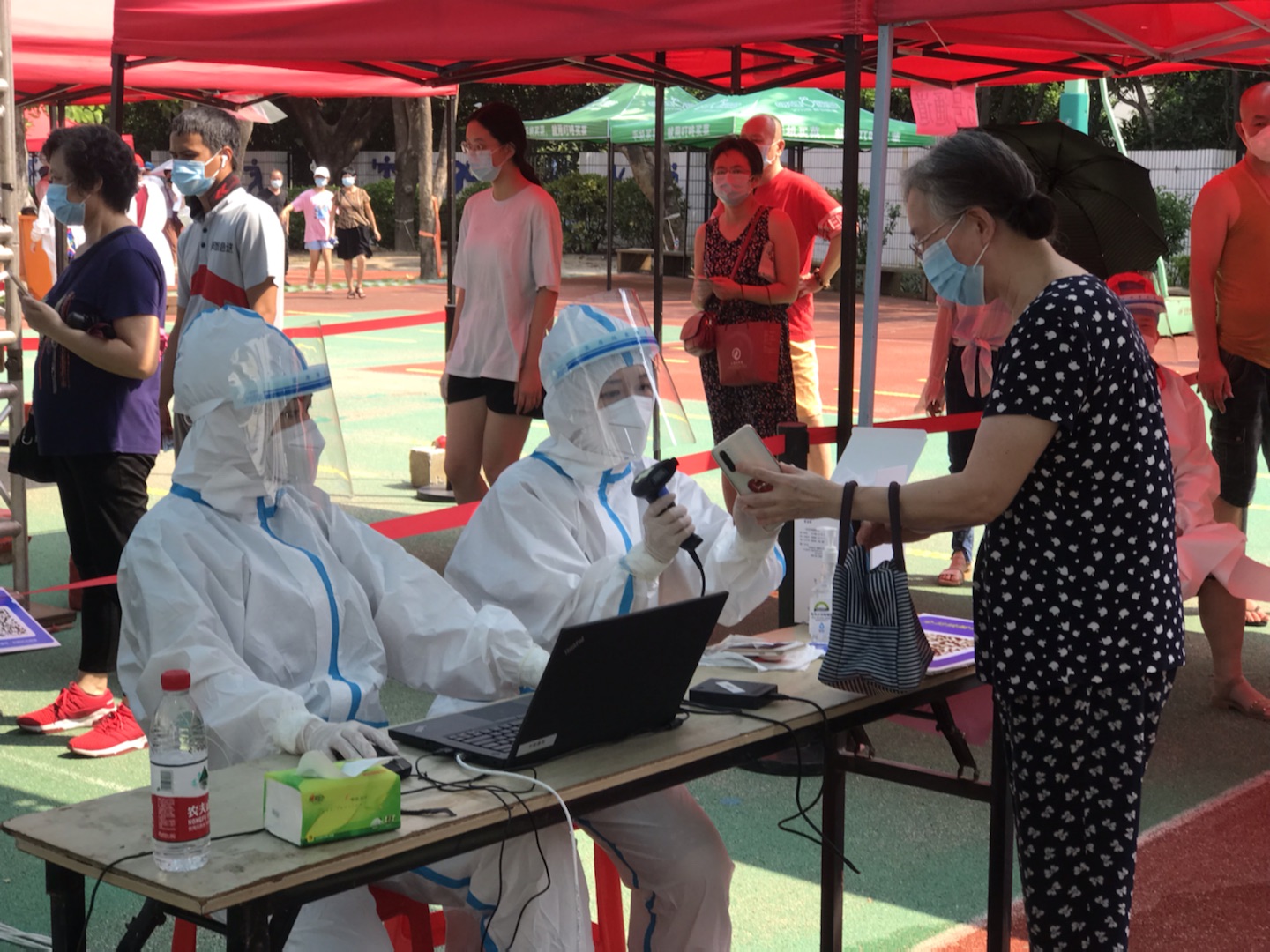从清晨微光、烈日当空到夜幕降临,老师们穿着密不透风的工作服,忙碌在核酸检测的现场,不厌其烦地录入、拿拭子、核证件、维序.....录入信息时,透过满是雾气、模糊不清的面罩,核对再核对,保证信息准确无误。高温炙烤下,防护服是湿了又干,干了又湿,为了保证全员核酸工作的顺利进行,老师志愿者们仍然坚守阵地,高效、高质量地完成了任务。