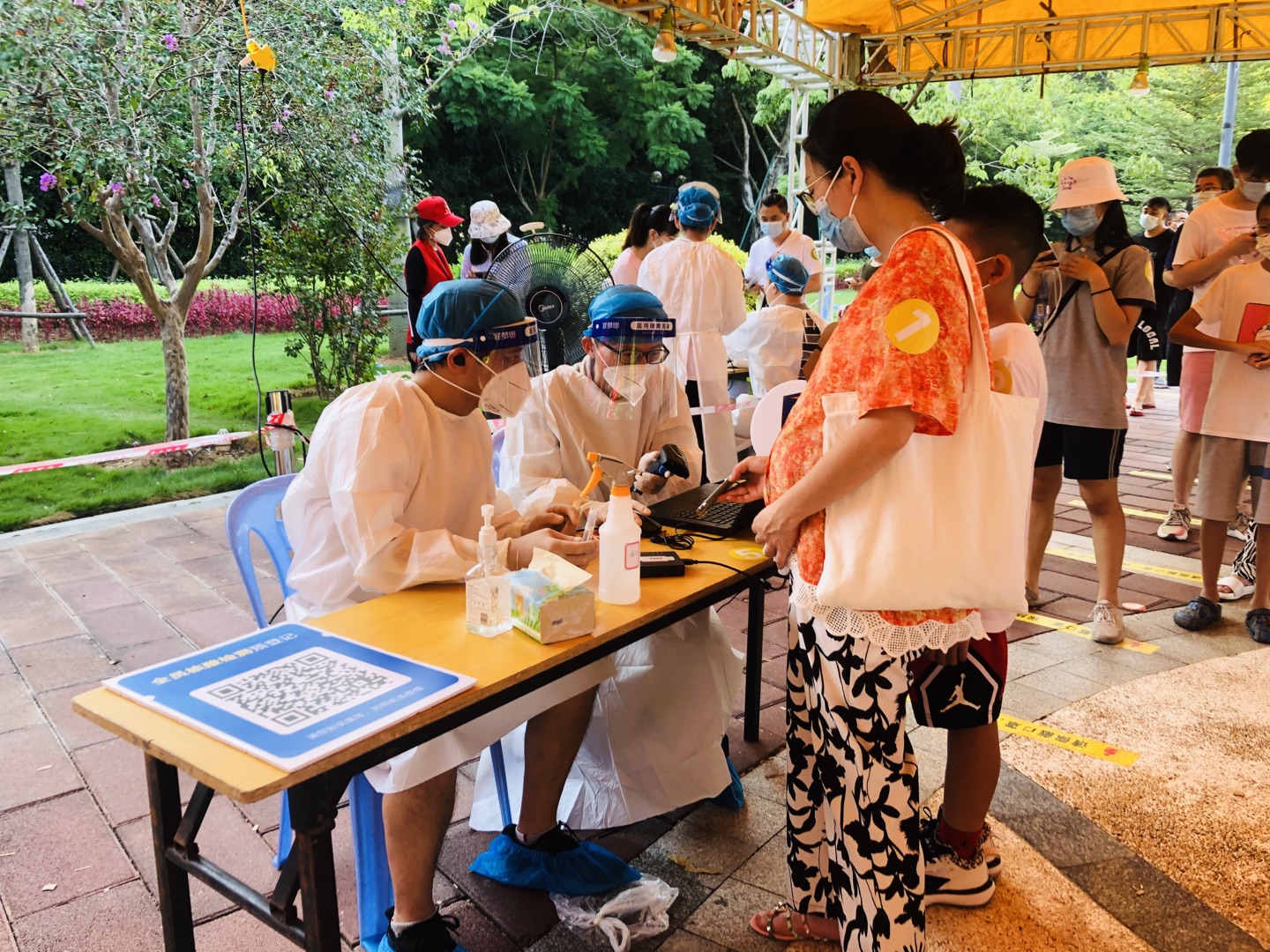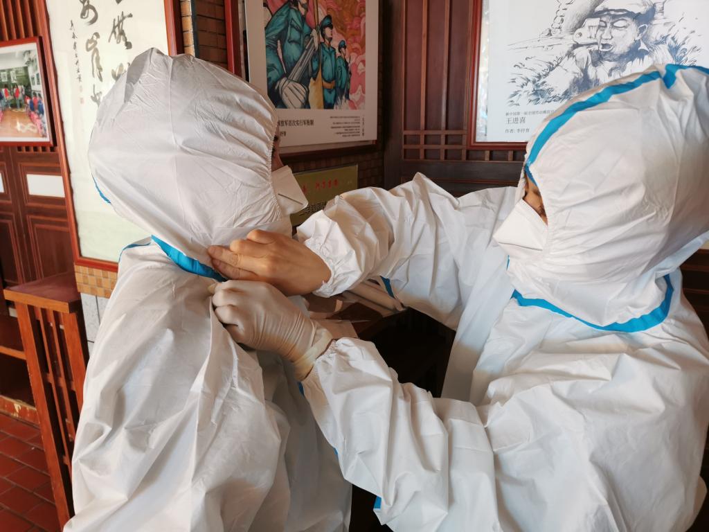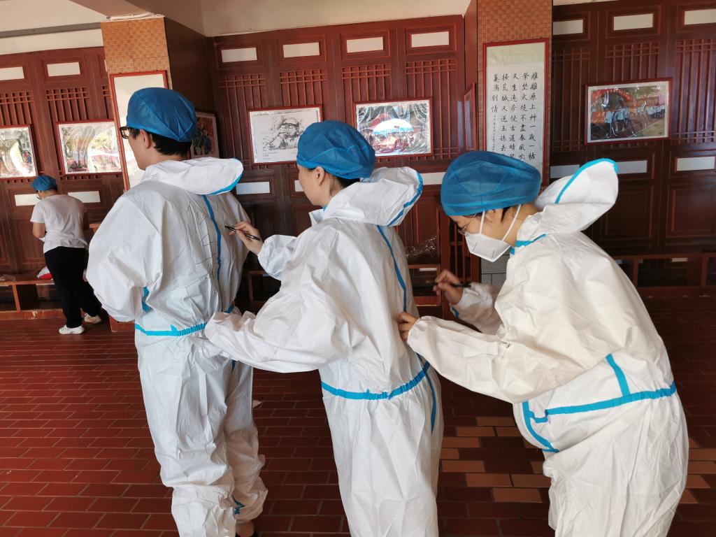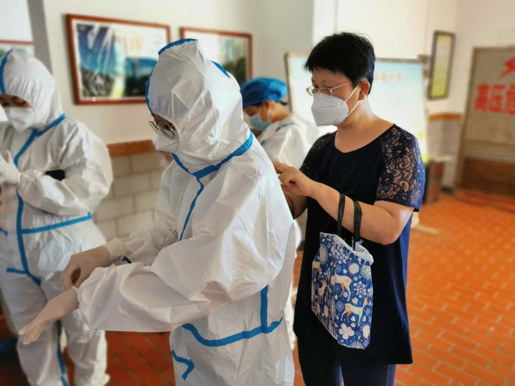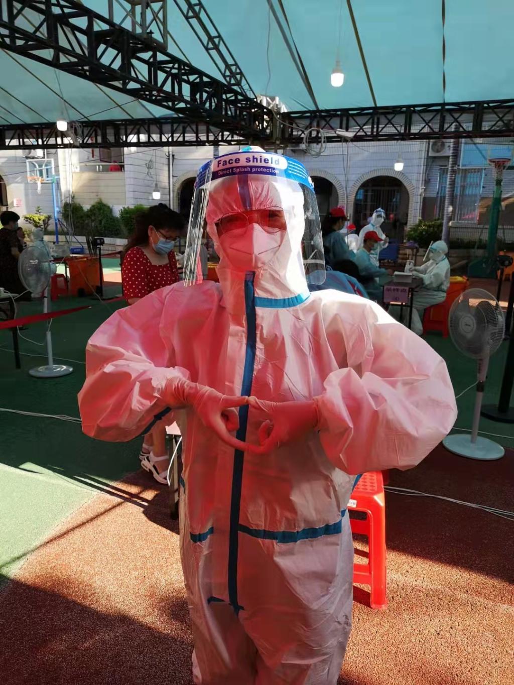 穿上防护服义无反顾,脱下防护服满身汗水。即使天气炎热,教师志愿者们依然冲锋在最前线,用汗水和坚持与逆行者同行,坚守在自己的岗位,不畏骄阳,耐心细致,只为疫情防控核酸检测工作能更快更好地完成。