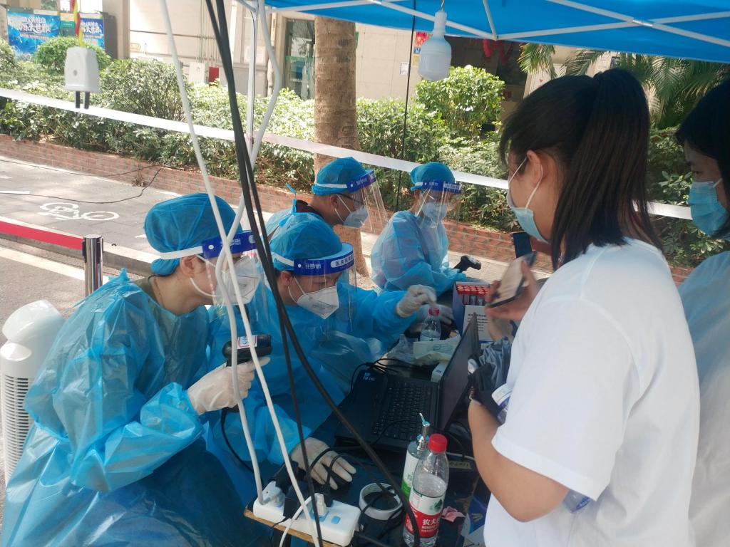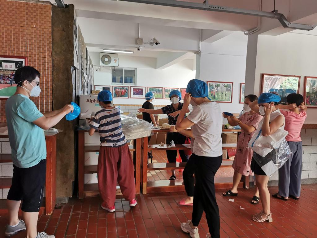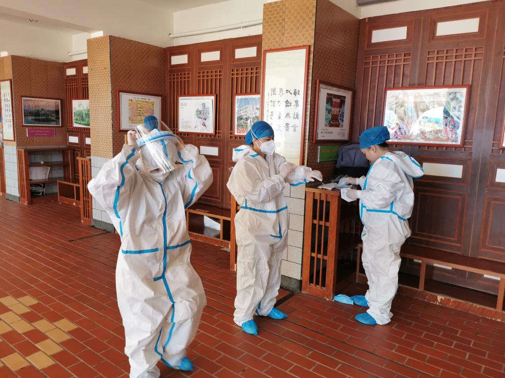 此次多轮核酸检测,时间紧,人数多,任务重,教师志愿者们一到现场就迅速做好防护措施,准时上岗,积极投入工作中。