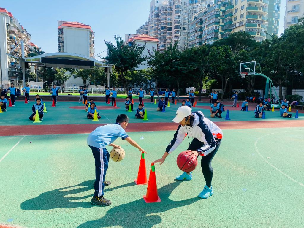 陈艺芬老师的《篮球体前变向换手运球》充分发挥学生的能动性,引导学生主动参与练习,在游戏中体验运用体前换手运球技术成功过标志物的快乐,培养学生的体育素养。