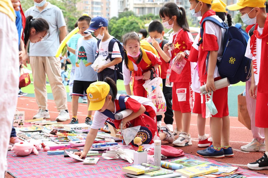 各班级学生们设置的摊位前人头攒动,热闹非凡,吆喝声、叫卖声、欢笑声不绝于耳,同学们从交易活动中体会新奇与趣味,成了校园里一道道靓丽的风景线……吸引了无数师生驻足观赏,争相购买。