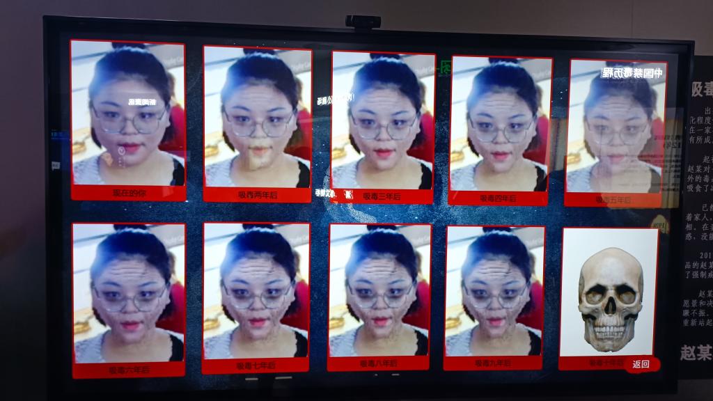 最令我们印象深刻的莫过于利用科技手段,看到吸食毒品后的容貌:脸上由长满皱纹和黑点,再到下巴越来越尖,样子简直惨不忍睹,同学们纷纷表示真希望以后永远不会有人吸毒了。