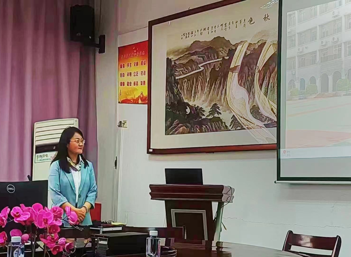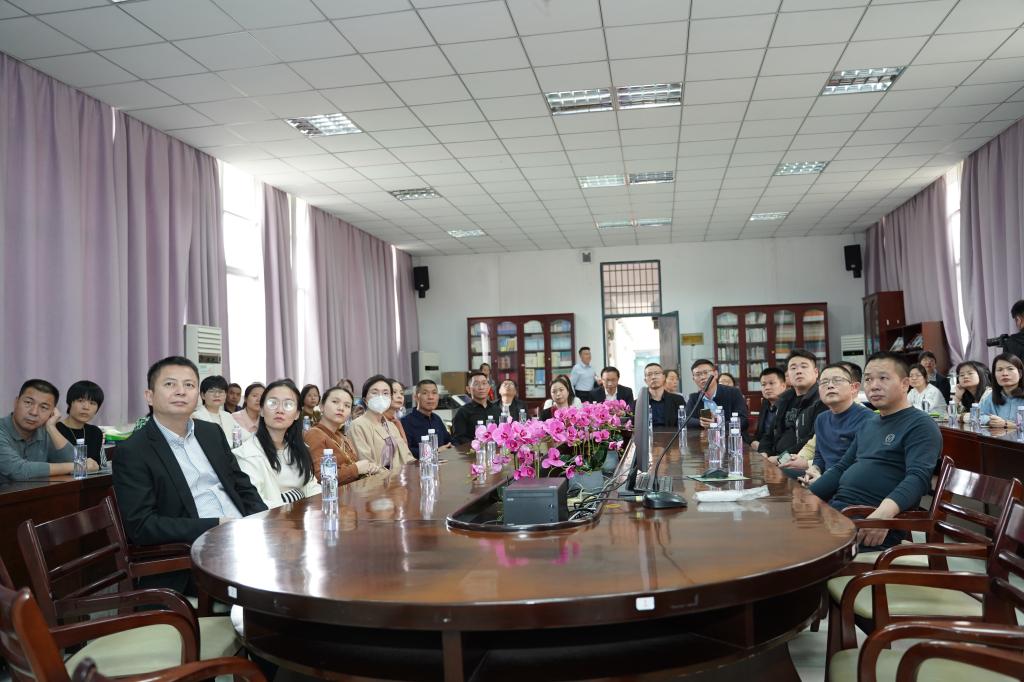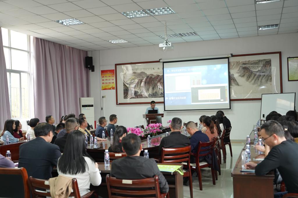 参观结束后,参会人员一行人移步会议室。在江锦莺副校长致辞欢迎之后,办公室主任潘金盛老师围绕“教育数字化转型,技术赋能学生成长”这一主题进行分享,简要介绍我校在学校管理、课堂教学、学生作业、学生评价等方面尝试数字化转型,在技术赋能下创建智慧校园,助力学生成长。