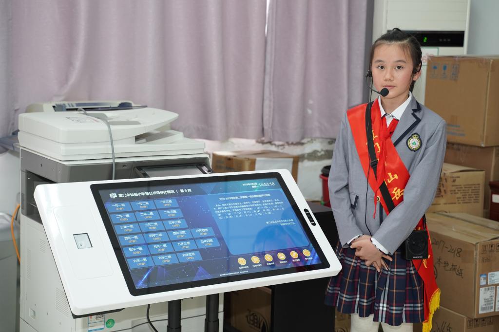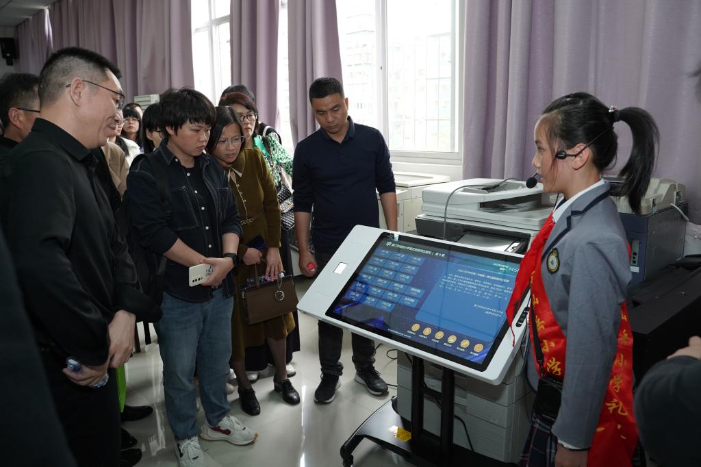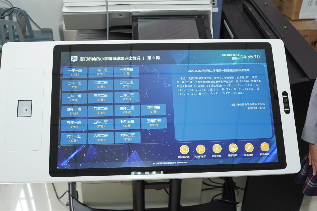会议室的智慧屏吸引了不少来宾的目光。据五2班小解说员谢昕妍同学介绍,全校师生可以通过智慧屏查询学校公告、班级五项评比情况,还可查询图书藏书,提前预借图书……功能丰富,实用性强。在小解说员的演示下,来宾们纷纷尝试,对学校智慧屏称赞不已,对我校智慧化管理予以肯定。