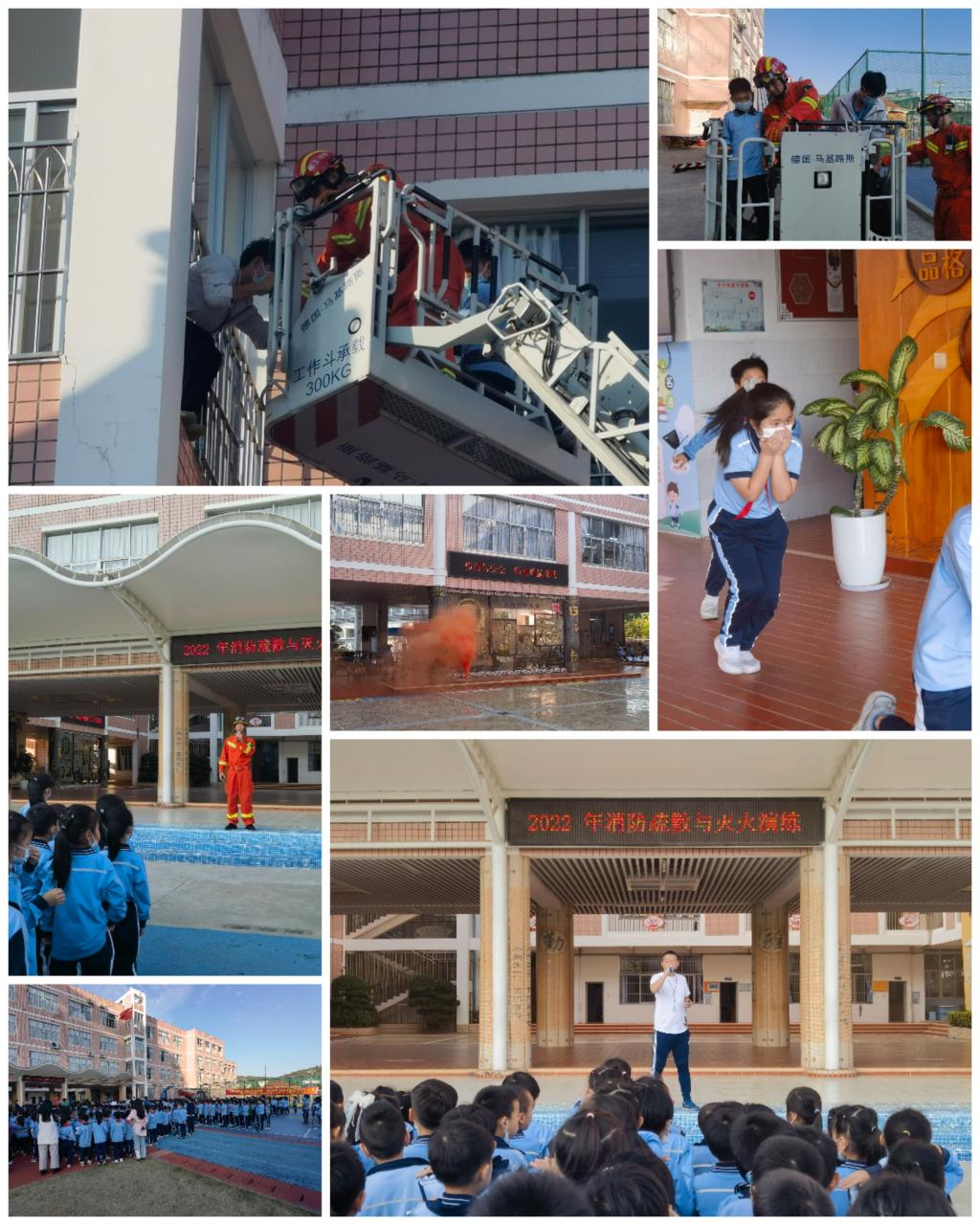 演练分三部分进行:首先由教职工参与灭火培训与演练;第二部分模拟某处着火,师生有序进行疏散;第三部分一师一生窗口挥彩色衣服模拟求救,再云梯车升空救援。活动结束,办公室付老师与曾厝垵消防站周副队长进行消防演练点评与云梯车高空救援介绍。