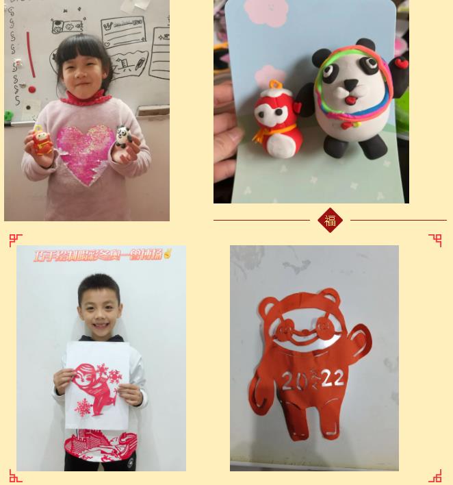 瞧,心灵手巧的小园宝们还用彩泥捏出趣味的造型, 或用彩纸剪出可爱的冰墩墩、雪容融,十分逼真!