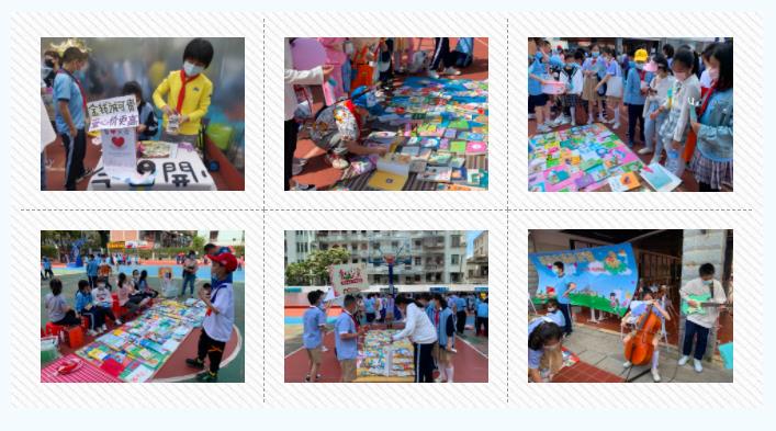 义卖前,大家共同动手!搬书、搬凳子、摆桌布、布置摊位的身影随处可见。引人注意的义卖海报、色彩缤纷的桌布、精致童趣的摊位饰品、尽显班级风采的店名、摆放整齐的图书。更可贵的是六年级同学主动协助一年级小朋友搬书、指导他们摆摊,大手拉小手尽显温馨;师生一起动手,智慧共生,书香共享......