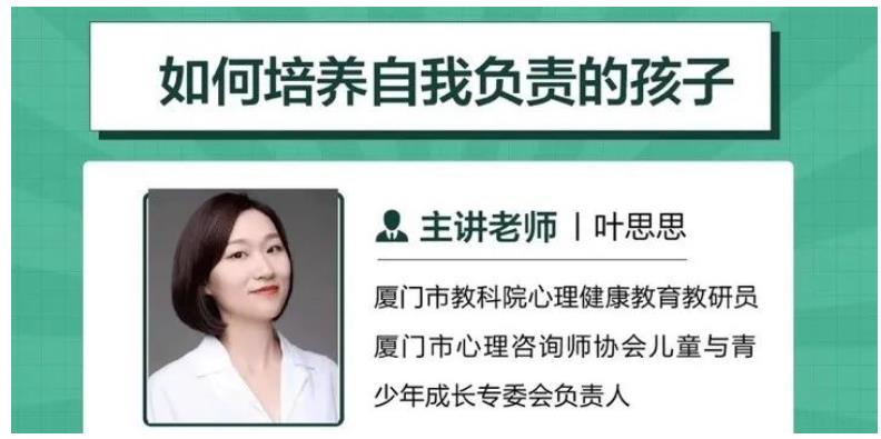 为进一步增强家校联系,搭建共育平台,丰富我校家长家庭教育方法,促进学生健康成长,4月29日晚上,我校组织全校家长聆听了厦门市教科院心理健康教育教研员、厦门市心理咨询师协会儿童与青少年成长专委会负责人叶思思老师主讲的家庭教育公益讲座,主题是《如何培养自我负责的孩子》。