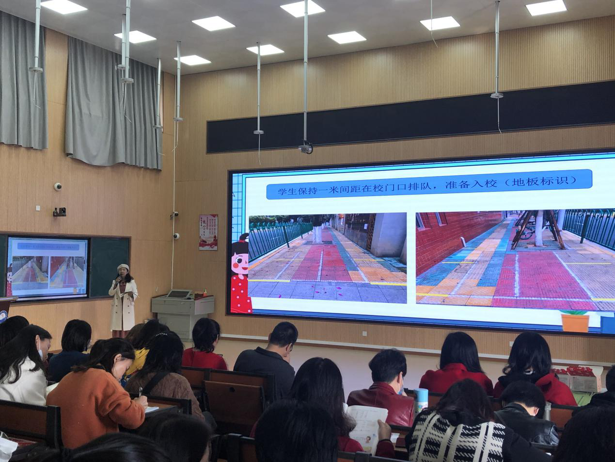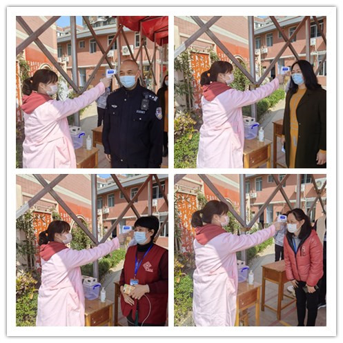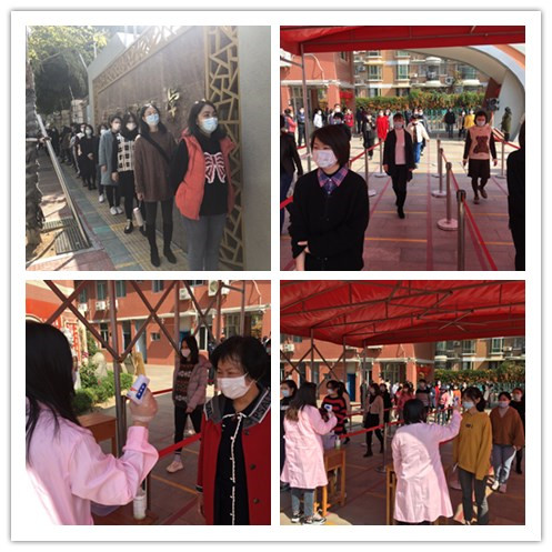 场景一:开展晨、午检体温检测。学生有序在校门口人行道按照前后左右1米间隔有序入校,老师们按照指定场地进行体温监测。