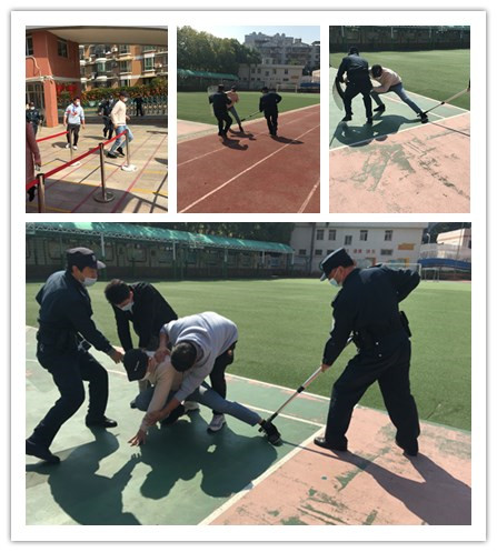 场景三:发生不配合亮码测温,强行闯入校园事件。校园反恐队伍第一时间进行防御,同时学校立即启动《莲龙小学反恐防爆应急预案》,及时制服“歹徒”。