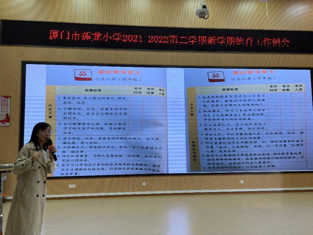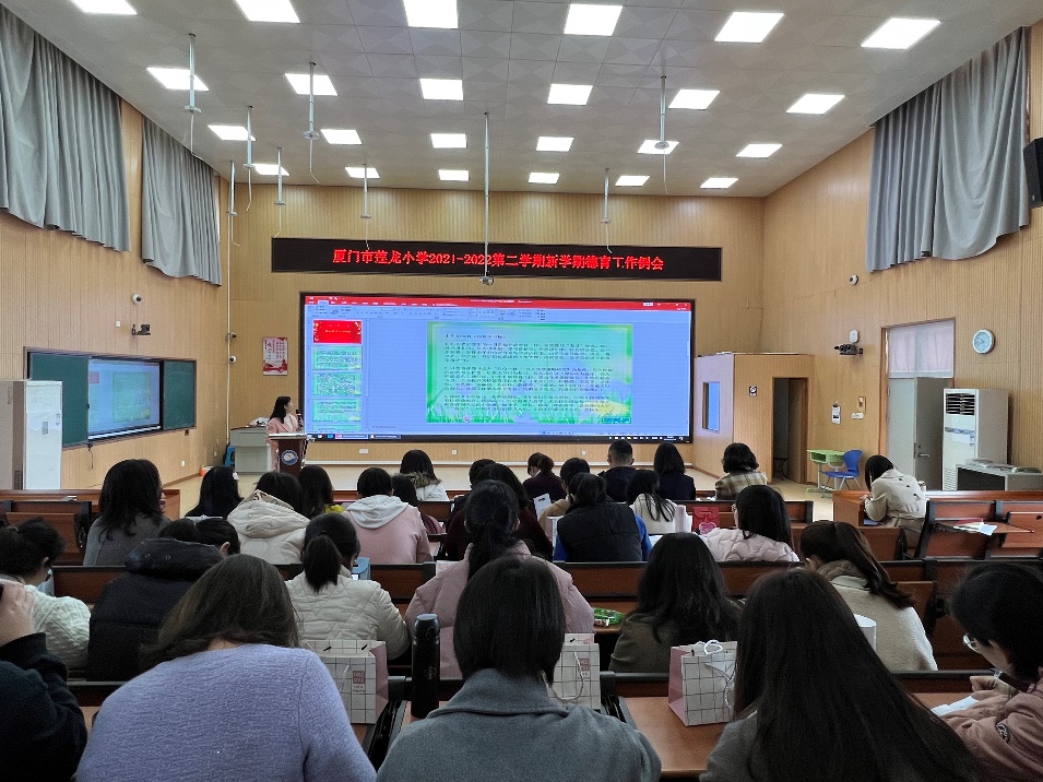 最后,由林频老师针对第二学期少先队工作与全校班主任做一个简单的交流。其中包括:期初工作要点部署、学期工作计划交流、班队会内容安排说明和红领巾争章行动的介绍等方面。