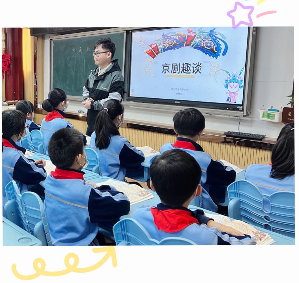 许伟强老师以《京剧趣谈》一课带领着学生欣赏了国粹——京剧的博大精深,课上采用了丰富的教学资源拉近了学生与京剧的距离,在教学由扶到放的过程中,让学生感悟京剧“虚实相生、动静结合”的艺术特点。通过本堂课许老师向学生传递了传统艺术传承与发展的育人价值,也在学生心中埋下了艺术的种子。