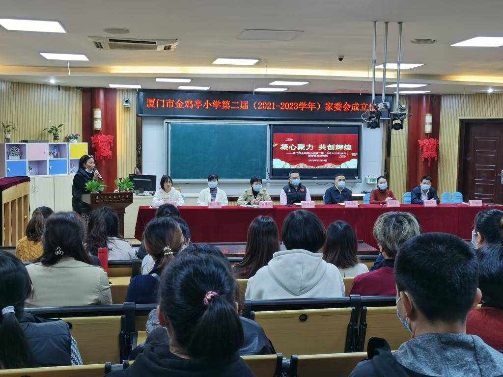 家长委员会,是学校联系学生家长的桥梁和纽带。成立家长委员会,对于建立学校、家庭与社会教育协同机制,提高家长的教育素养和家庭教育水平,具有重要意义。为进一步加强学校、家庭与社会教育的有机结合,形成教育合力的全面发展,金鸡亭小学于12月24日在多功能厅教室举行第二届三级家委会成立大会。本次会议由德育处副主任曾玲珊老师主持,金鸡亭小学林赞忠校长、钟利富书记、周荣娟副校长、校长助理兼德育处主任詹梅珍老师及学校、年段、班级三级家委参加了本次活动。