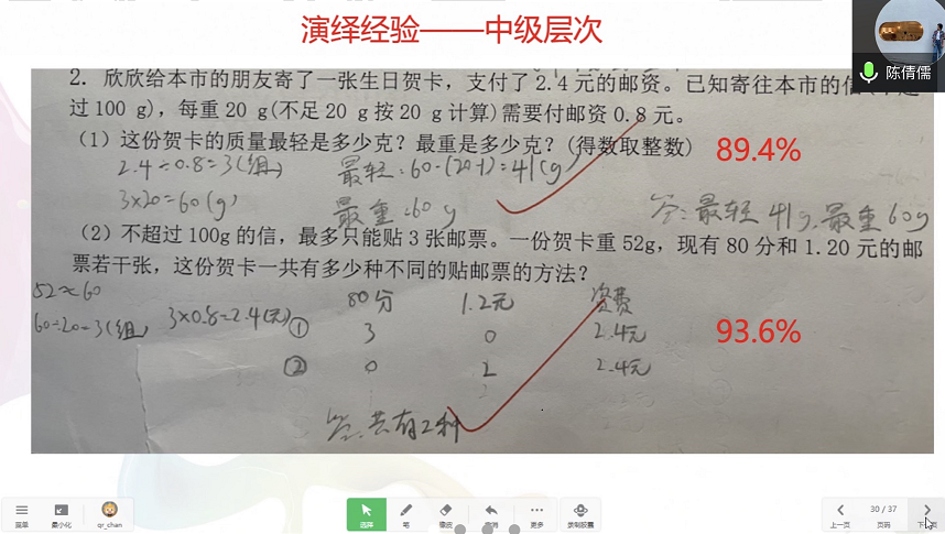 陈老师通过说播课的方式从演绎经验的角度介绍自己的设计意图与经验凸显,并通过学生后测情况进行量化反馈。