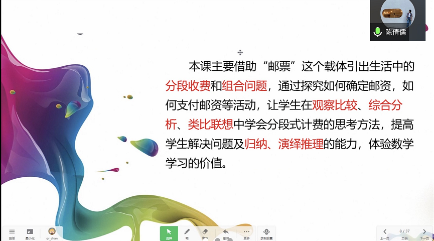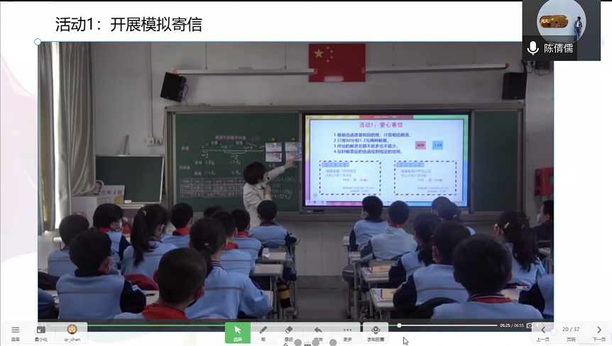 金鸡亭小学陈倩儒老师执教的是六年级下册《邮票中的数学问题》一课。陈老师通过贴近学生生活的“咖啡邮局”真实情境导入,引发学生的学习兴趣,通过设计层层递进、环环相扣的三个活动环节,培养学生观察、猜想、归纳、演绎的能力,促进数学基本活动经验的积累。