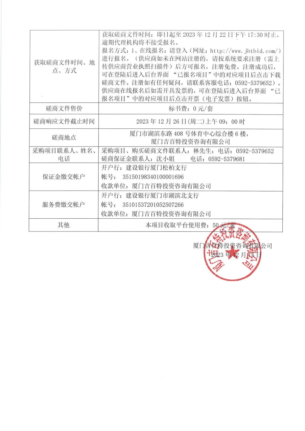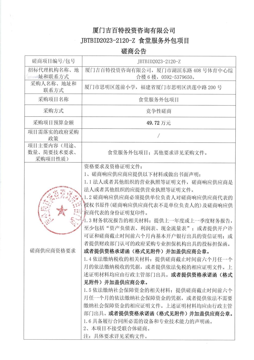 厦门吉百特投资咨询有限公司JBTBID2023-2120-Z 食堂服务外包项目磋商公告