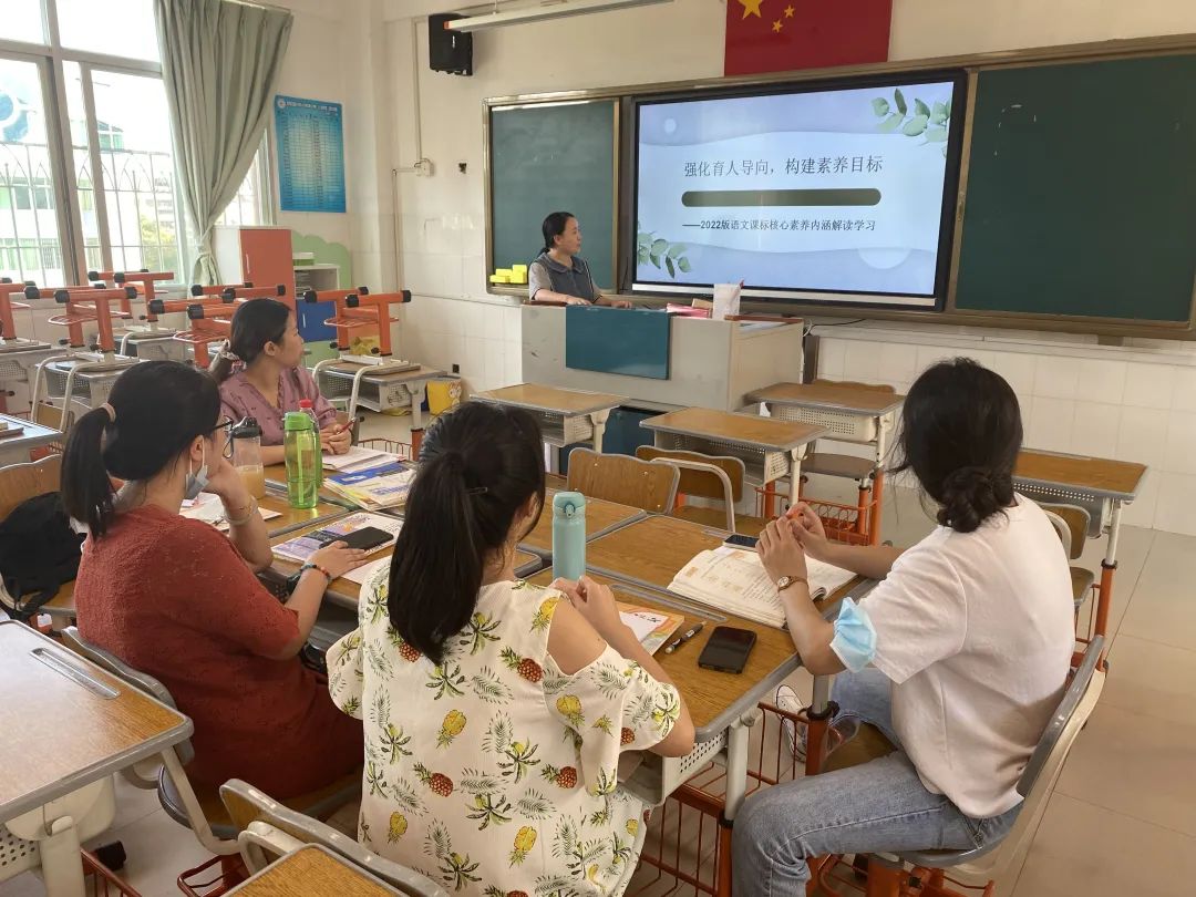 我校新课标学习方案第一阶段是自主学习阶段(7-8月),在此阶段每位学科教师认真研读相关学科的《2022课程标准》。充分利用知网研学平台,查阅2022版新课标以及相关解读文献。学校于7月和8月各推送1次课标线上检测题。第二阶段是交流研讨阶段(8月),线上各教研组由组长先组织专题学习、教学研讨、交流反思,在学科群里共享网上优秀课标解读资源。线下8月30日下午学校以“聚焦新课标,教材新解读”为题,组织教师分学科开展学习交流活动,先分备课组人人交流分享,然后每个备课组在推选一位在大教研组里分享。