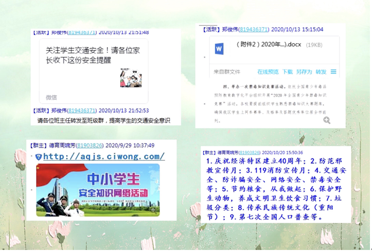 我校德育处不定期通过《给家长的一封信》,宣传栏、学生家长QQ群推送、网上安全平台的作业布置,让全体家长和学生一起通过认真阅读学习观看视频,网上知识竞赛等形式,进一步了解、提升、增强防范意识,遵守交通安全法规,懂得基本的网络操作安全,不明链接不随意点开等。提高自我保护能力。