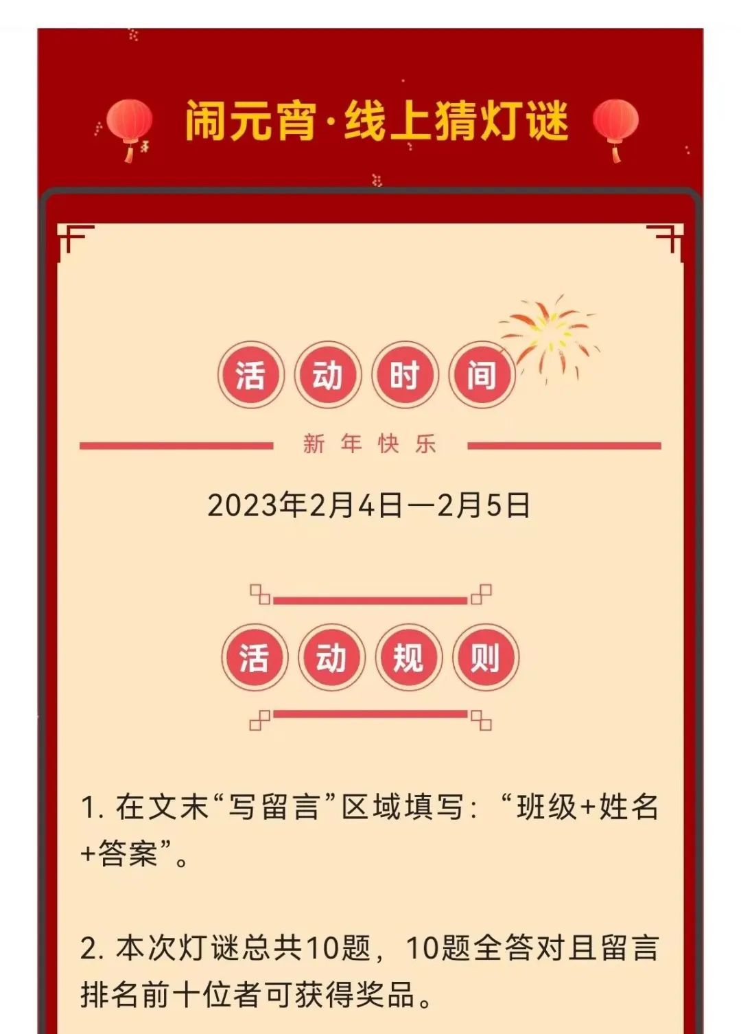 猜灯谜又称打灯谜,是中国独有的传统民俗文娱活动,自南宋起,我国就有元宵猜灯谜的习俗。我校也准备了“闹元宵·猜灯谜”线上有奖猜灯谜活动,让我们看一看同学们表现得怎么样吧!