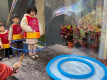 集体科技秀活动开始了,老师们变身“科学小博士”,为孩子们上演了“腾云驾雾”“大型泡泡秀”“空气炮”等科学游戏。孩子们在阵阵惊呼声中,了解了干冰和热水碰撞后,会冒出浓浓的“烟雾”。感受了大型泡泡的神奇和有趣。懂得了不管是三角形还是圆形的炮口,打出来的空气炮都是圆形的。