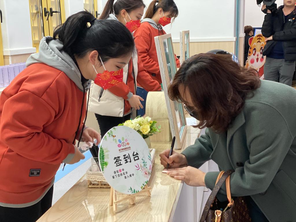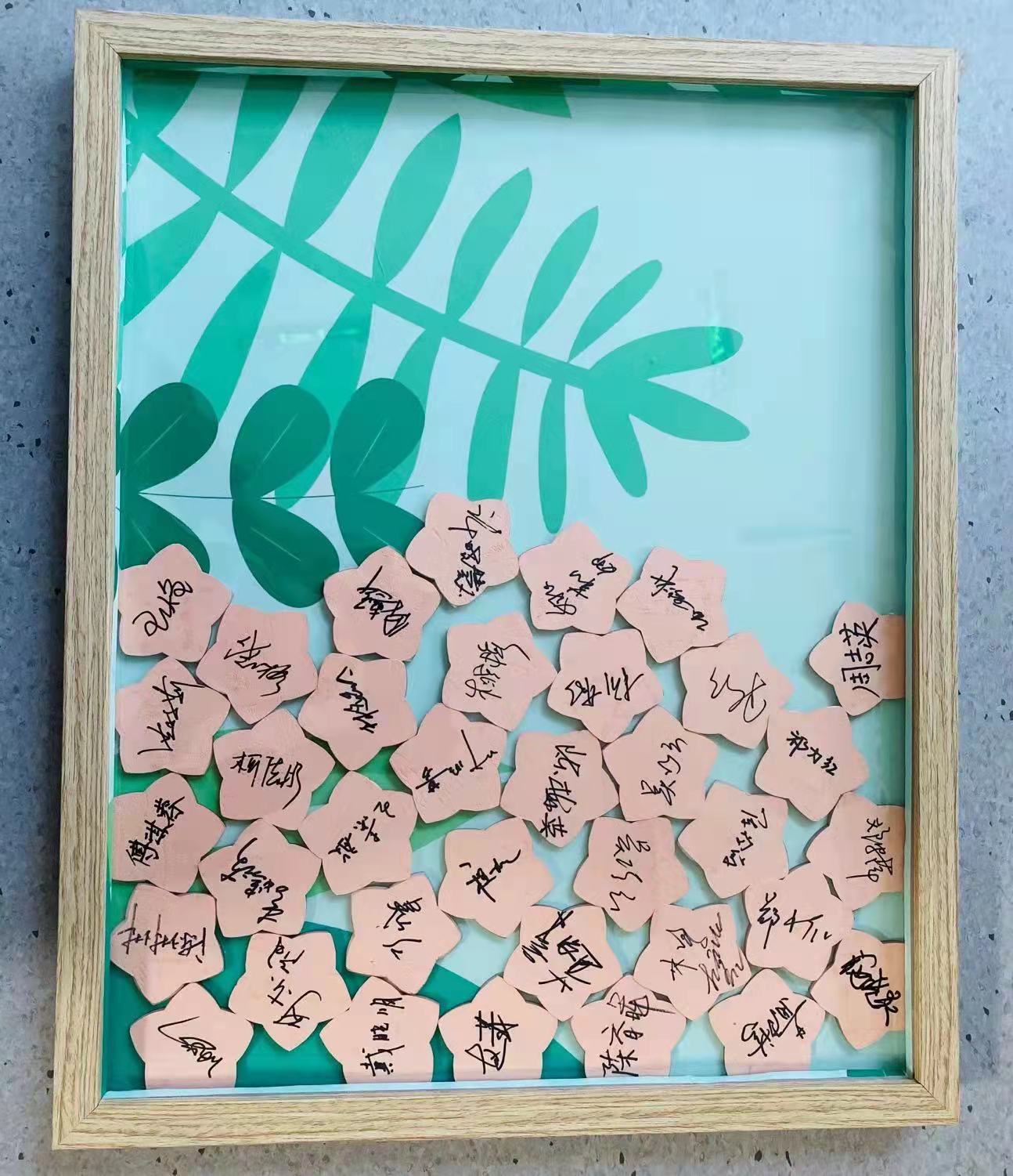 雨天伞湿,递上贴心的雨伞袋。迎入大厅,现场钢琴伴奏声悠扬,园长们在印有园标的花瓣上签名,投入签到箱,组成一幅花满枝桠的美丽画面,给五幼留下美不胜收的纪念。