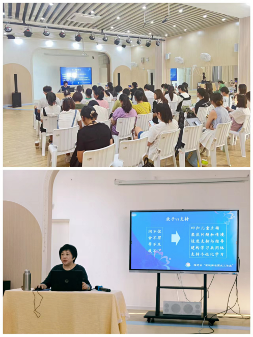 葛主任聚焦儿童立场,从幼儿游戏新高度、幼儿混龄游戏的新优势、放手VS支持以及幼儿混龄游戏的实践四个方面进行了生动地阐述,同时还结合了幼儿园的真实案例同老师们进行分享、解读,传递了回归儿童立场,观察在前,支持在后的理念。葛主任提出,放手和支持其实并不矛盾,而是辩证的。在理念上的放手是基于对幼儿的观察,在观察中理解幼儿的发展,是从退一步到退一百步实际的放手,而在游戏中的支持,是放手和多元化支持,关注方法维度、人的维度以及时间维度,是进一步到进一百步的“专业”支持。教师放手让幼儿玩、让幼儿表达、让幼儿从失败中汲取新的经验,这些都能够促进幼儿在游戏中的深度学习。