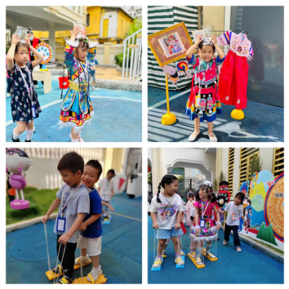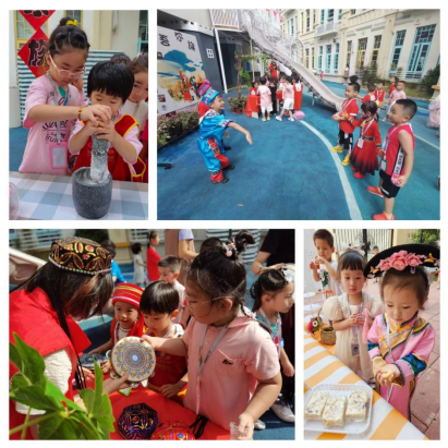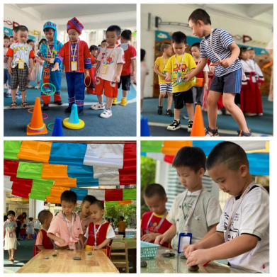 五幼以民族团结为契机,选择了其中九个民族,将他们的特色游戏和美食带到了孩子身边。孩子们手持中国地图,开启了旅行。汉族传统游戏套圈趣味非凡;藏族的五彩经幡不断飘扬;朝鲜族的顶翁竞走、壮族的板鞋竞速紧张刺激;维吾尔族的葡萄干和红枣、土家族的糍粑、满族的沙琪玛和酸梅汤回味无穷;傣族的孔雀园、蒙古族的敖包让孩子身临其境,不同民族的风情让孩子们乐在其中,收获颇多。老师们的民族特色服饰,也让孩子们直呼太好看了。