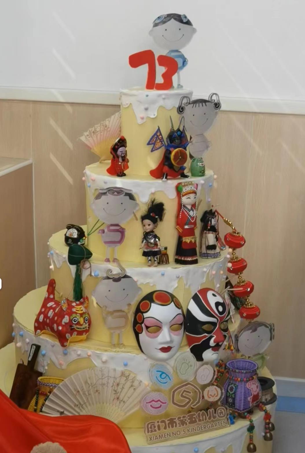 祖国之花,蕴涵着56种芬芳,缺一不可。孩子们将带来的民族特色物品布置在蛋糕上,不仅使蛋糕变得多彩,更让孩子们感受到祖国的生日也是56个民族的生日,56个民族是一家!