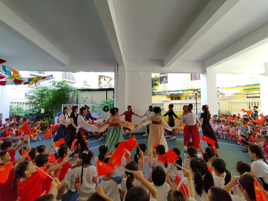 在此举国同庆的时刻,老师们也精心准备了有趣的表演。融汇了多个民族的《爱我中华》、饱含深情的《我和我的祖国》以及婀娜多姿的傣族舞蹈,孩子们的掌声和欢笑是最好的赞赏。最后的拉歌活动中,孩子们充满感情地唱起了一首一首红歌,将美好的祝福献给祖国。