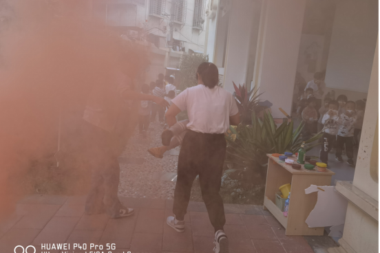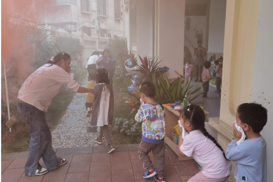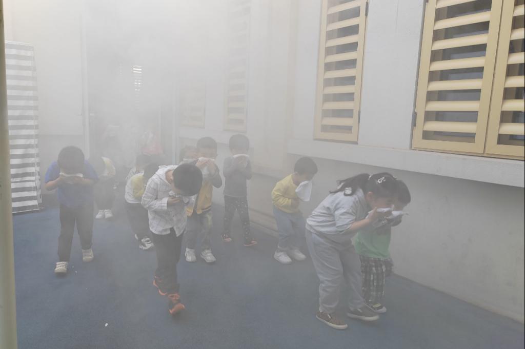 听完消防讲座后,即将开始全园消防演习。为了增加消防演习的真实性,园内还投放了数颗烟雾弹制造现场,不一会儿,随着响彻云霄的警报声响起,所有老师安全有序的组织幼儿快速撤离疏散。