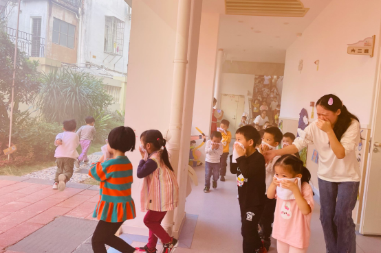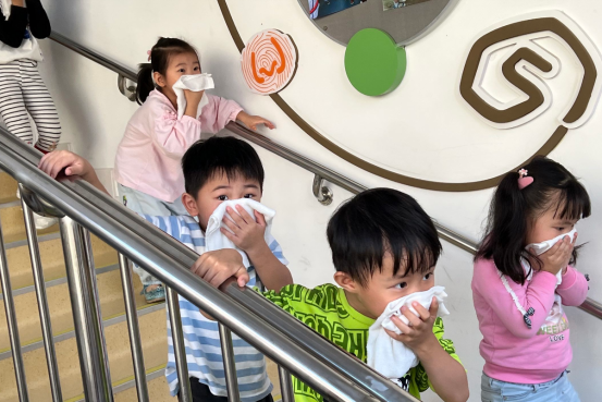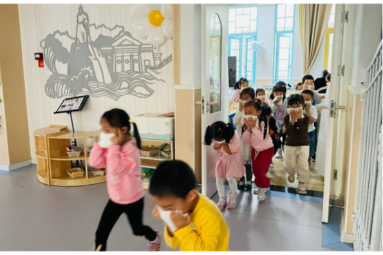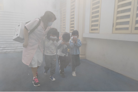孩子们拿起湿毛巾、捂住口鼻、弯腰小步快走,按指定逃生路线有序撤离到安全疏散区。到达安全区后,各班老师及时清点本班幼儿人数进行汇报,做到不落下任何一人。