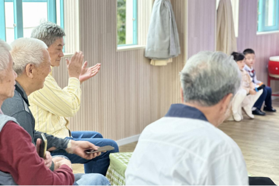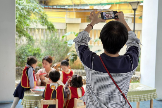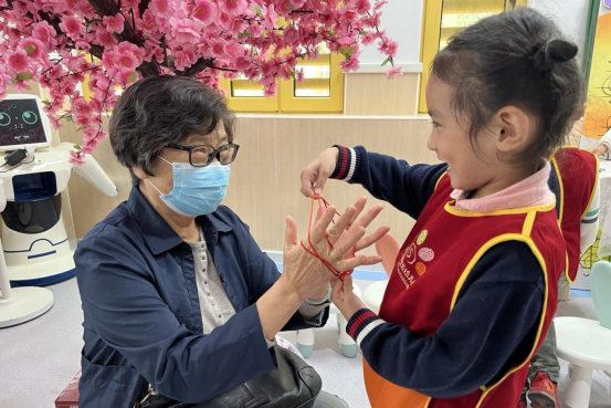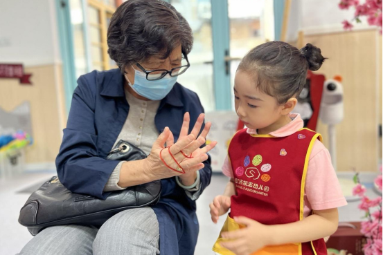 随后一行人走至大厅,爷爷奶奶们与孩子同玩“翻花绳”“打陀螺”“套圈"等游戏,和孩子们亲切交流,小朋友们热情问好,他们的稚嫩和天真可爱,逗得传来开心的笑语,在雨景中的五幼呈现出一副美好的画面。