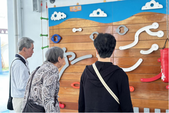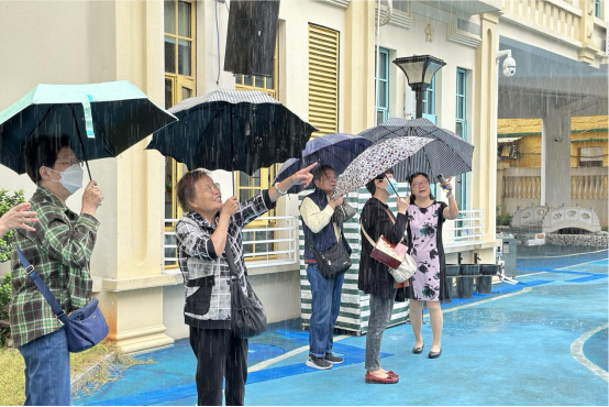雨滴打在树叶上,发出美妙的声音,听着滴答雨声,表演结束后园长带队一行人撑着伞在淅淅沥沥的雨中参观我园的园所园貌。走过“城堡滑梯”“秘密基地”“思源”“魔法墙”等,爷爷奶奶们纷纷发出感叹,可谓是“麻雀虽小,五脏俱全”,五幼的建筑童真与老厦门元素相结合,处处重视孩子的参与性和主人地位,当了解到是孩子自己命名的地名时更是称赞不已。