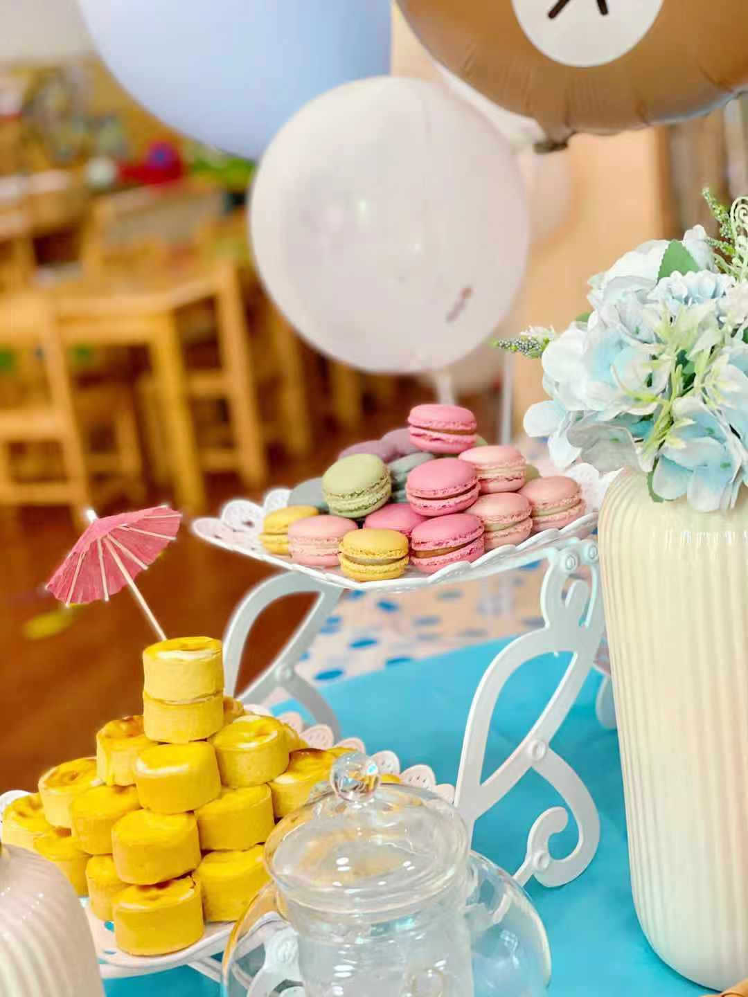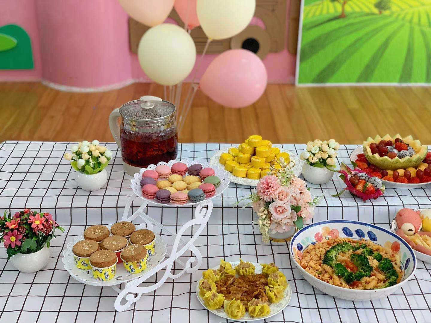 此次自助餐的食谱,是园长妈妈带领全体老师用心讨论的智慧结晶。厨房阿姨们大显神通,为孩子们准备了丰盛的自助餐点。有可爱的小动物餐包、多彩的果蔬馒头,还有意大利面、鲜肉烧麦、炸鲨鱼柳、薯条、蜜汁鸡翅、生煎肉、咖喱鱼蛋;水果有哈密瓜、草莓、火龙果还有红提。西点师阿姨还做了美味的杯子蛋糕、曲奇饼干、马卡龙和一口芝士。