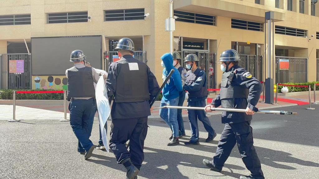 场景三:暴恐分子盯上放学回家的幼儿和家长,趁其不备发动袭击,八幼保安人员快速上前制服。八幼安全领导小组成员按下一键式报警按钮,通知社区保安团队和派出所民警进行支援,暴恐分子的同伙被赶来协助的派出所民警和小区保安队控制。