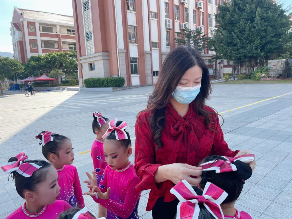 郑小红园长贴心地为萌娃们整理服装发饰。