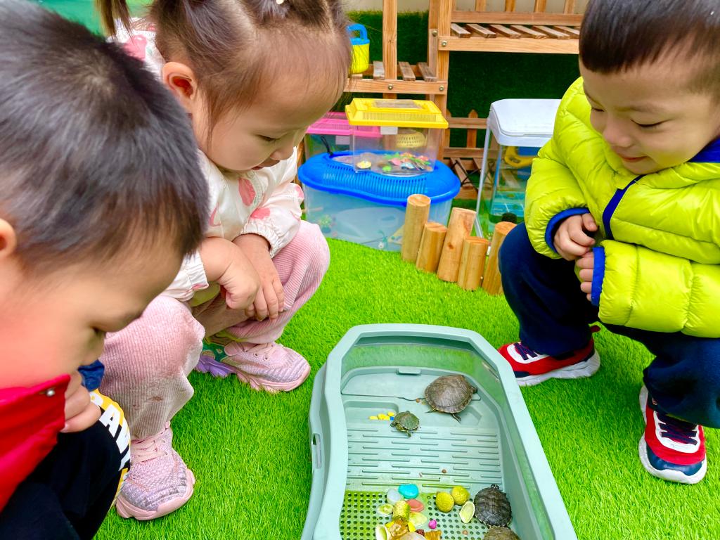 看,饲养区里有正在打洞的蚂蚁、丑萌丑萌的角蛙、可爱的小金鱼、常驻嘉宾乌龟等,这简直就像一个小小的动物王国!孩子们给小动物制作名片、给小鱼喂食、给乌龟安家,在养护过程中观察到的是生命的珍贵与伟大,整个过程是一场值得孩子回味无限的生命教育。