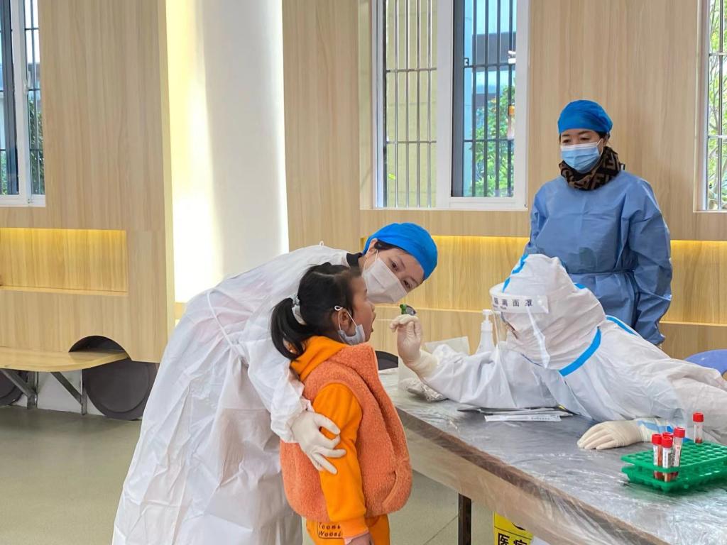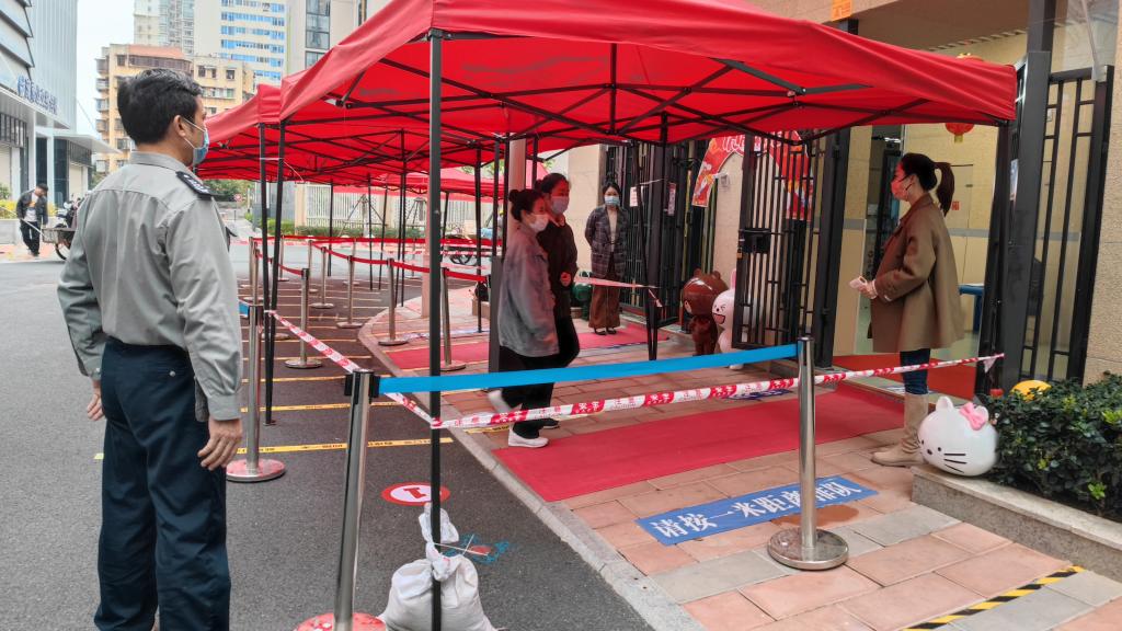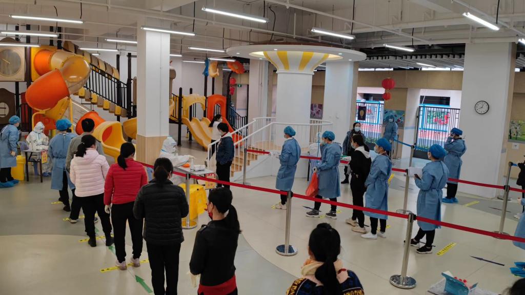 为了让检测更加有序,郑小红园长提前在现场对各个环节进行周密部署,指出问题及时调整。负责核酸检测的医生准备就绪,孩子们根据错峰核酸时间来园,依次有序排好队伍,保持一米间距,佩戴口罩,在老师的带领下按照顺序逐一进行检测。孩子们在老师温柔的引导下,仅用时三个小时,高效、快速地完成了总分园全体师生核酸检测。