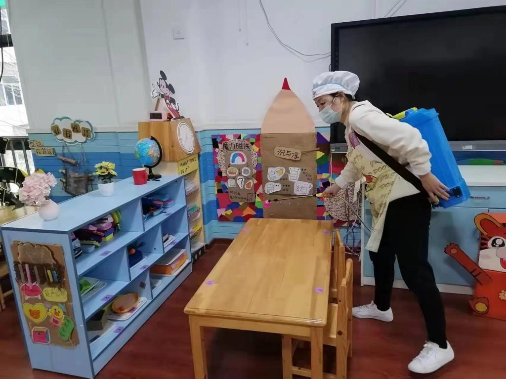 后勤人员对全园环境进行全方位的消杀,教室、走廊、操场……保育员细致地清洁幼儿园的环境卫生,为恢复线上教学保驾护航。