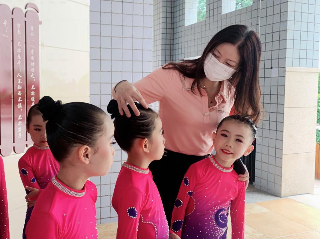 老师们早早来到幼儿园为孩子们的健美操比赛做准备。从发型发饰到鞋袜整理,都争取尽善尽美,为孩子们赛场上的优异表现做好保障。园长妈妈也来加油打气,小队员们士气十足。