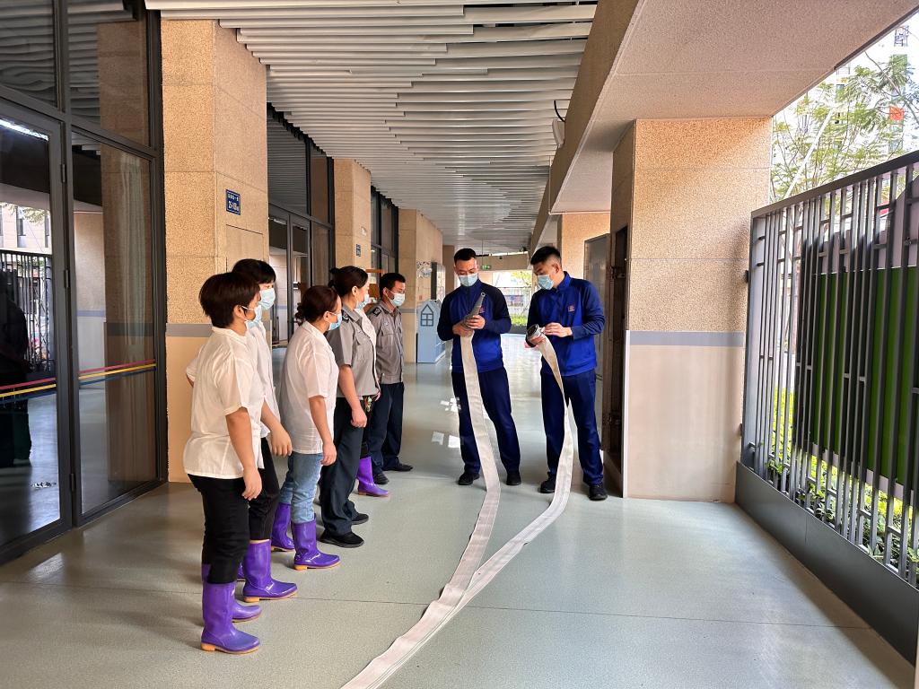 厦禾消防救援站的消防员们对后勤厨房人员、保安人员进行消防水带使用方法的培训,并指导实践操作。