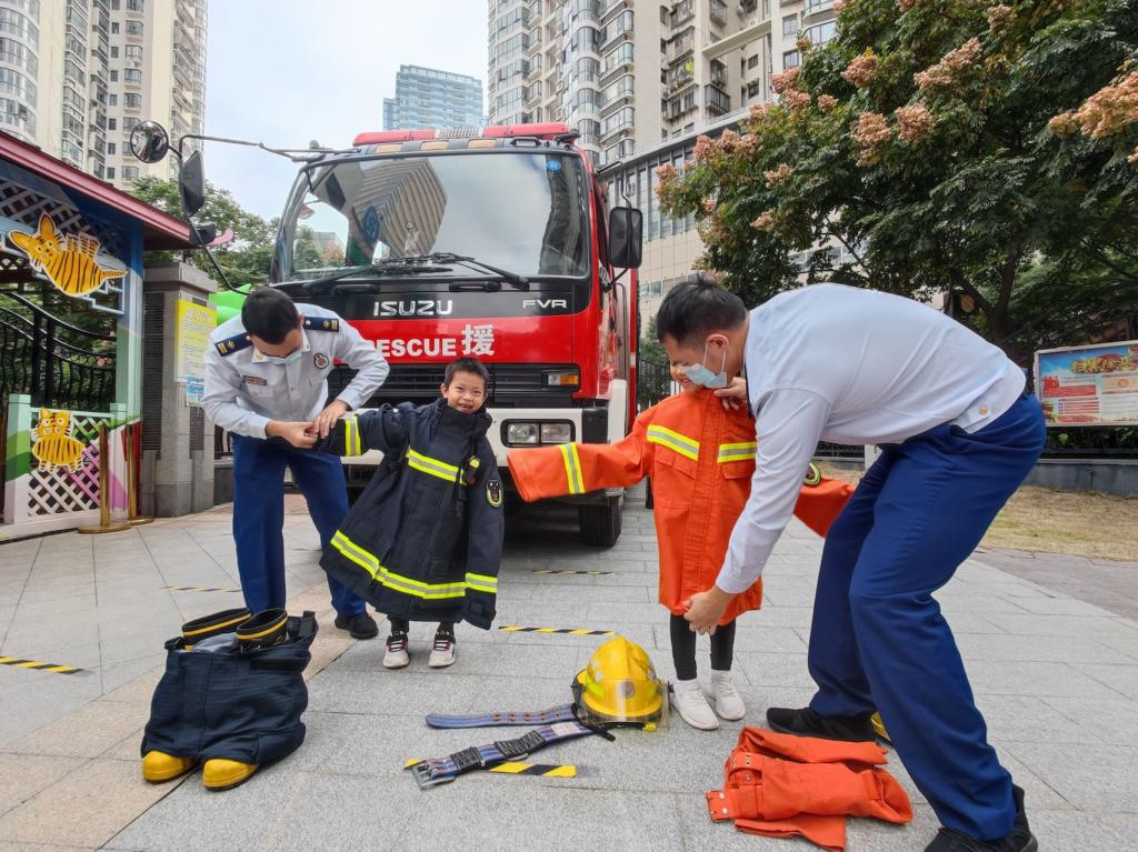 在消防员叔叔的指导下,萌娃尝试了穿灭火防护服、戴头盔、体验做名“小小消防员”,感受消防员叔叔们的辛苦。