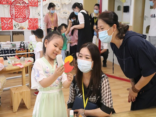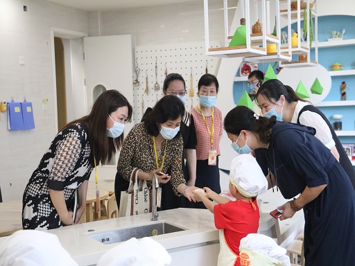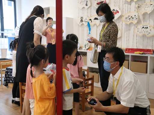 在赵菁园长的陪同下,领导们视察了总园过渡园区以及禾祥分园园舍环境,详细了解幼儿园办园规模、设施设备投入及使用情况等。迌日游戏中,孩子们的欢声笑语、大方介绍吸引领导们驻足,通过与孩子们的亲切交流,领导们感受到九幼充满文化特色的课程魅力,对幼儿园办园理念以及保教质量给予高度肯定。
