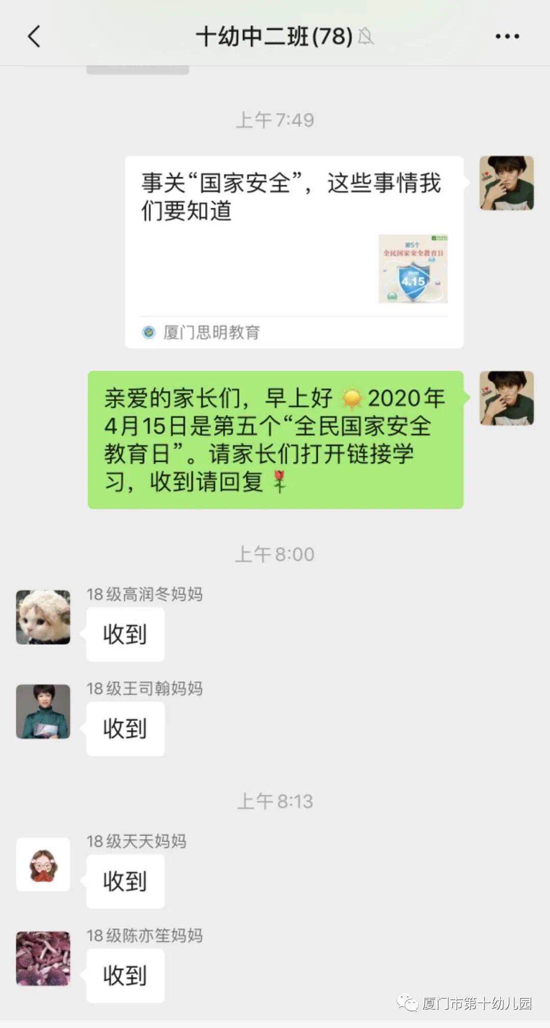 各班教师在认真学习完国家安全教育视频后,通过班级家长群推送关于“国家安全教育日”的相关内容,组织班级家长、幼儿一起观看国家安全教育视频,增强国家安全意识,共同维护国家安全。