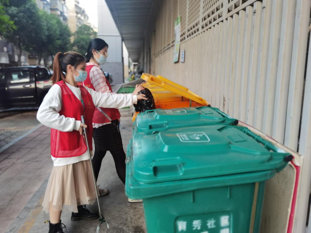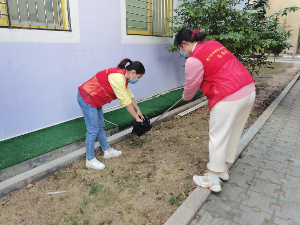 洁家园,美思明,见文明,教师争做洁净家园的参与者,为美丽思明贡献自己的力量。志愿者们手持清洁工具,清理育秀社区的烟头、纸屑等垃圾,力求不留卫生死角,展现青年教师不怕苦不怕脏的文明风貌。