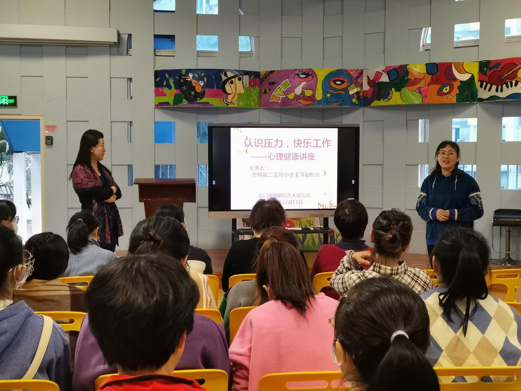为增强教职工心理健康意识和自我察觉、调节能力,塑造阳光心态,认识压力,快乐工作,做幸福教师。12月15日,思明艺术幼儿园特邀思明区第二实验小学副校长、国家二级心理咨询师、福建省优秀心理咨询师王萍老师,为思明艺术幼儿园带来一场特殊的讲座,开启一场安全、放松、真实的心灵之旅。