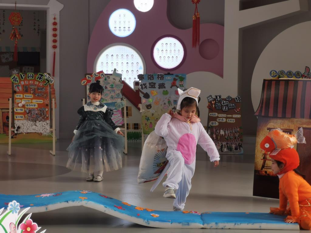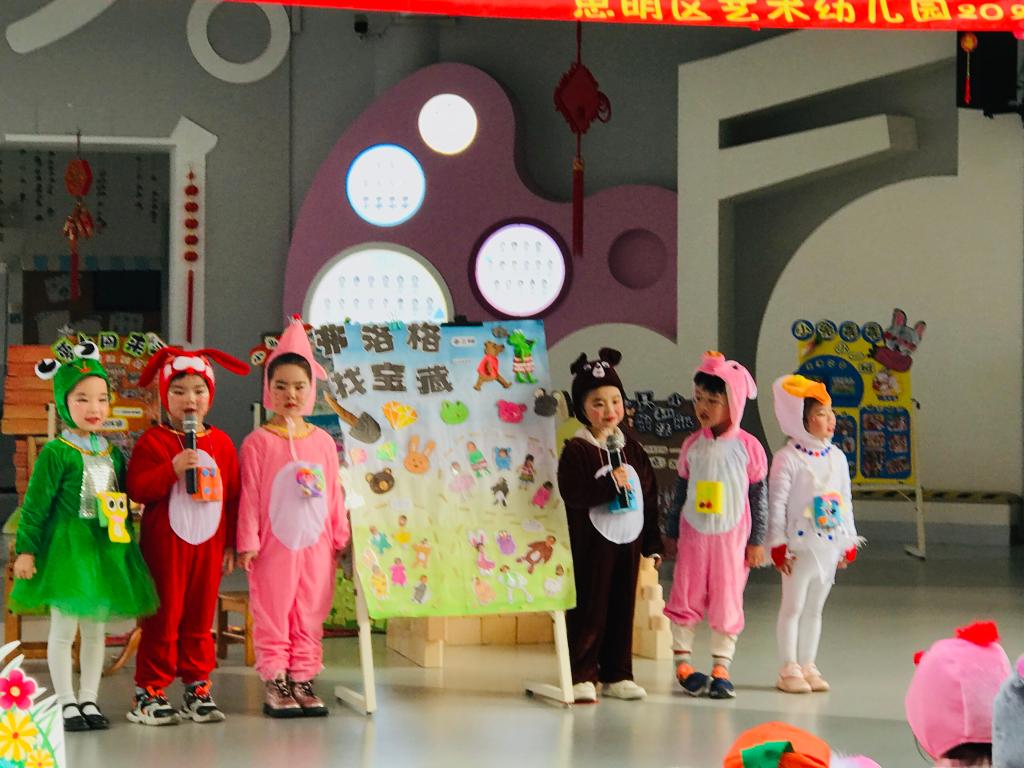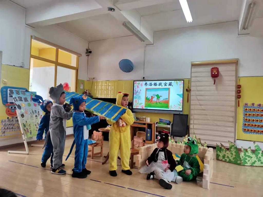 中二班童话剧《弗洛格找宝藏》:我们都是探险家,一起出发找宝藏。困难来了我不怕,朋友合作力量大。