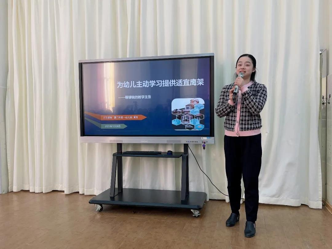 活动伊始,刚刚斩获福建省第五届中小学教师教学大赛幼儿园组特等奖第一名的吕冰心老师为大家带来她的心路历程。吕老师表示她在备赛过程中最大的收获则是对“育人”这一教育观的深度理解,如何在教育教学中培养幼儿正确的价值观是我们所有老师需要持续思辨的一个议题。