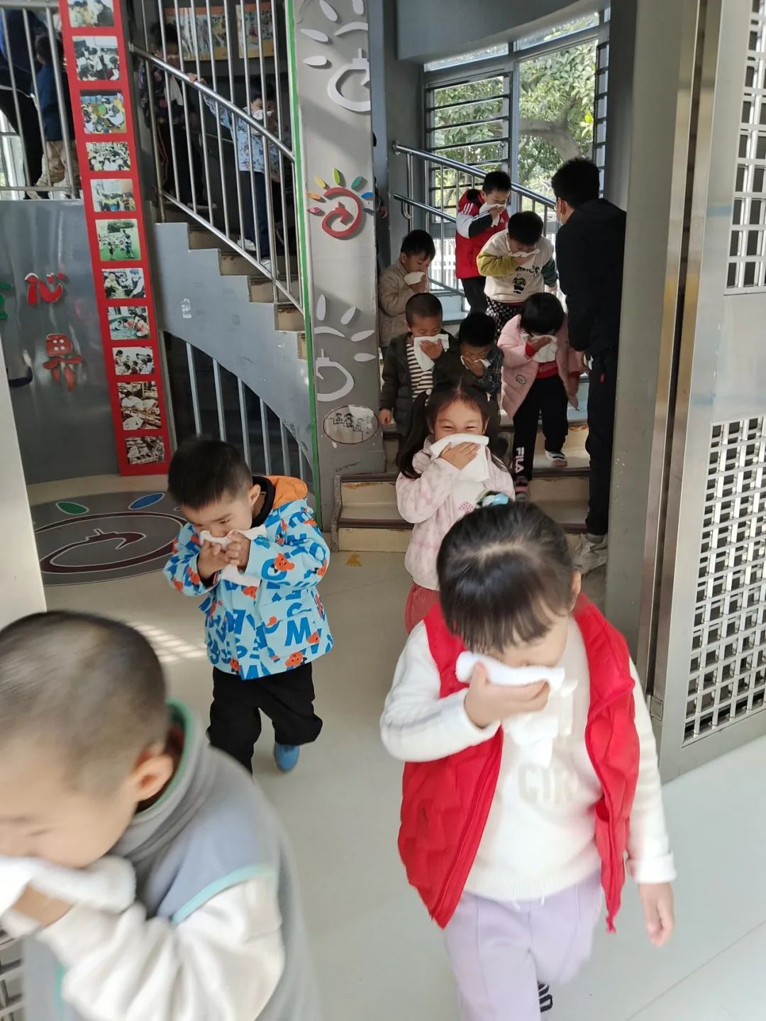 上午9::00,听到警报信号后全园师生立刻停下所有活动,开始消防应急疏散演练。各安全岗责任人迅速到位,在各个楼层的拐角处进行疏散和指引,班级老师快速组织小朋友们捂住口鼻,按照预定的疏散路线,有序地从班级向安全地带撤离。